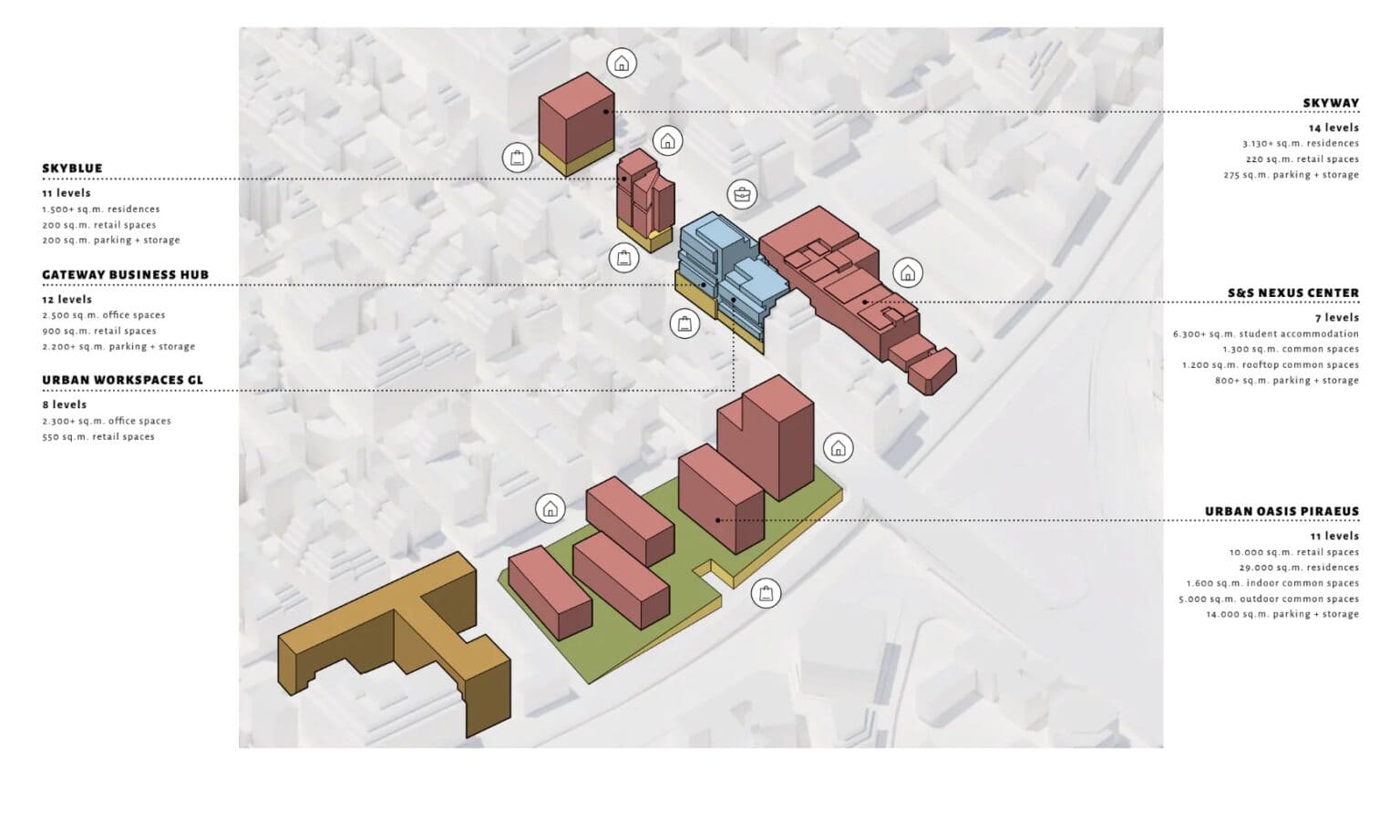 Σύμφωνα με το masterplan, θα αναπτυχθούν επιπλέον τα παρακάτω κτίρια στην περιοχή γύρω από το Urban Oasis Piraeus: